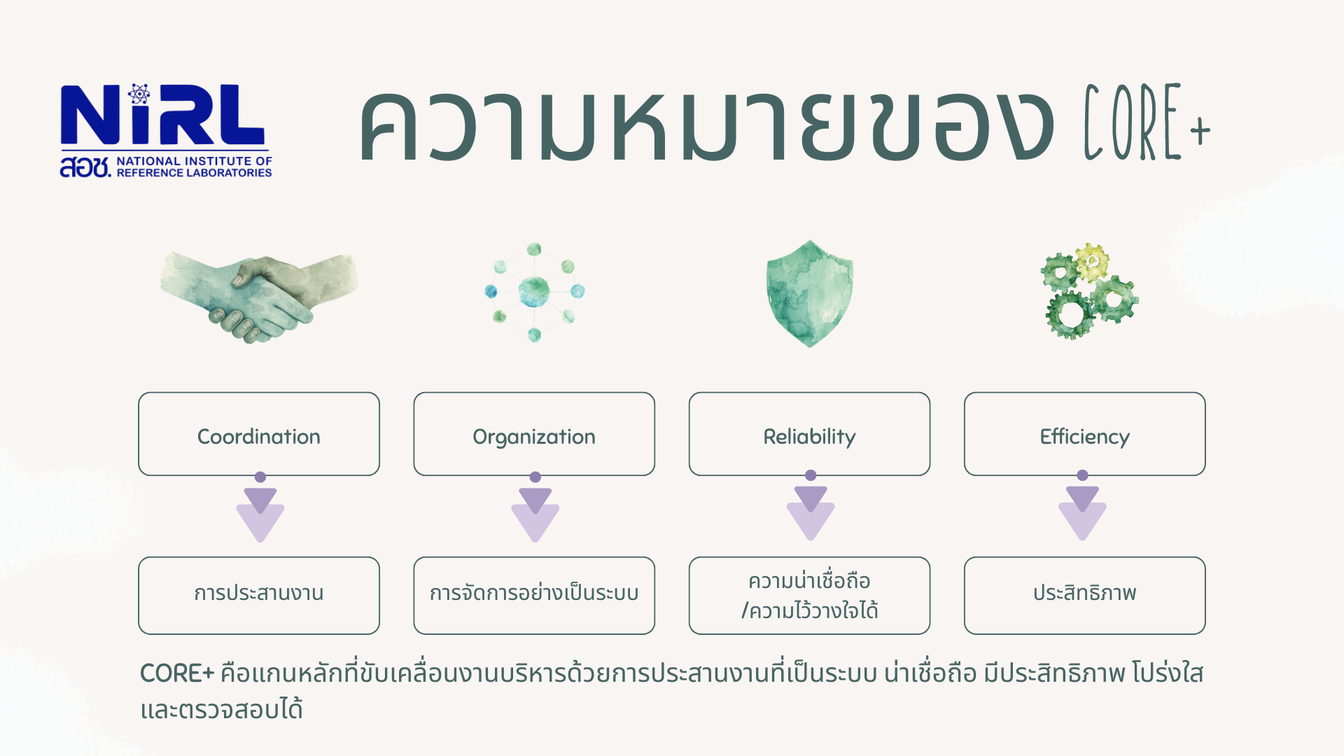 CORE+ คือ “แกนหลักที่ขับเคลื่อนงานบริหารด้วยการประสานงานที่เป็นระบบ น่าเชื่อถือ และมีประสิทธิภาพ โปร่งใส และตรวจสอบได้”