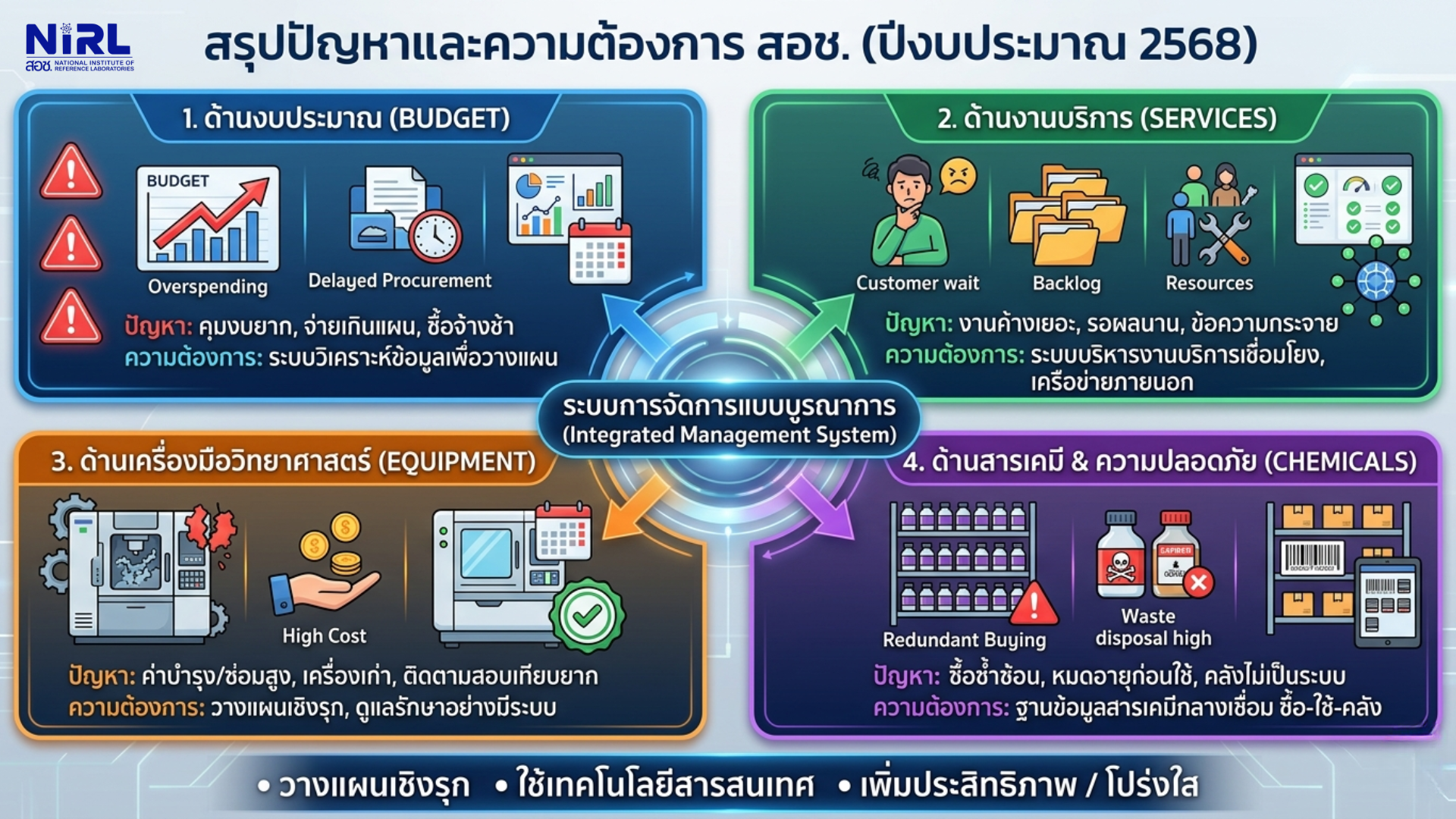 เพื่อพัฒนาและเชื่อมโยงระบบข้อมูลด้านการบริหารจัดการการใช้จ่ายงบประมาณ การให้บริการวิเคราะห์ ทดสอบ และสอบเทียบ การบริหารจัดการเครื่องมือวิทยาศาสตร์ และการจัดการสารเคมีของ สอช. ให้เป็นระบบบูรณาการเดียวกัน เพื่อสนับสนุนการวางแผน การควบคุม และการติดตามผลการดำเนินงานให้มีความถูกต้อง เป็นปัจจุบัน และสะดวกต่อการเข้าถึงข้อมูล ลดภาระงานเอกสารและขั้นตอนการปฏิบัติงานที่ซ้ำซ้อน ตลอดจนสามารถนำข้อมูลไปใช้ในการวิเคราะห์แนวโน้ม และประกอบการวางแผนด้านงบประมาณ การให้บริการวิเคราะห์ ทดสอบ และสอบเทียบ การสอบเทียบเครื่องมือวิทยาศาสตร์ และการจัดการสารเคมีในอนาคตอย่างมีประสิทธิภาพและคุ้มค่า